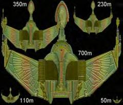 |  |  |    Masse: 186.000 metrische Tonnen Deckzahl: 15 Besatzung: 390 Krieger + 28 Brückenoffiziere   Unterlicht-Antrieb: Standartimpulsantrieb KIF-6 / 4. Generation Warp-Antrieb: Materie/Antimaterieantrieb KWE-8 / 6. Generation